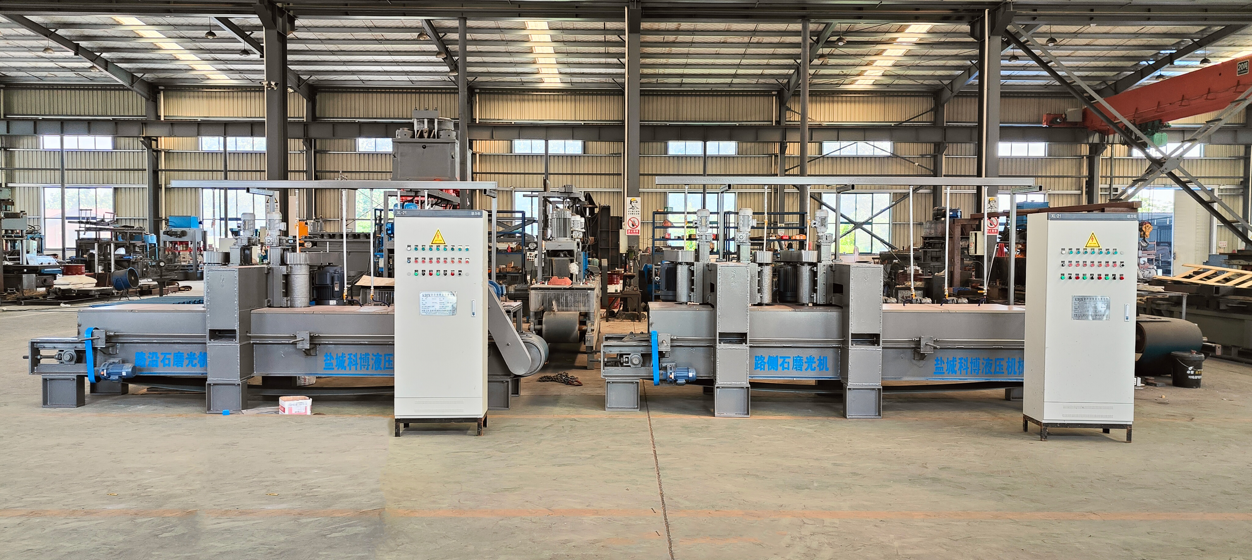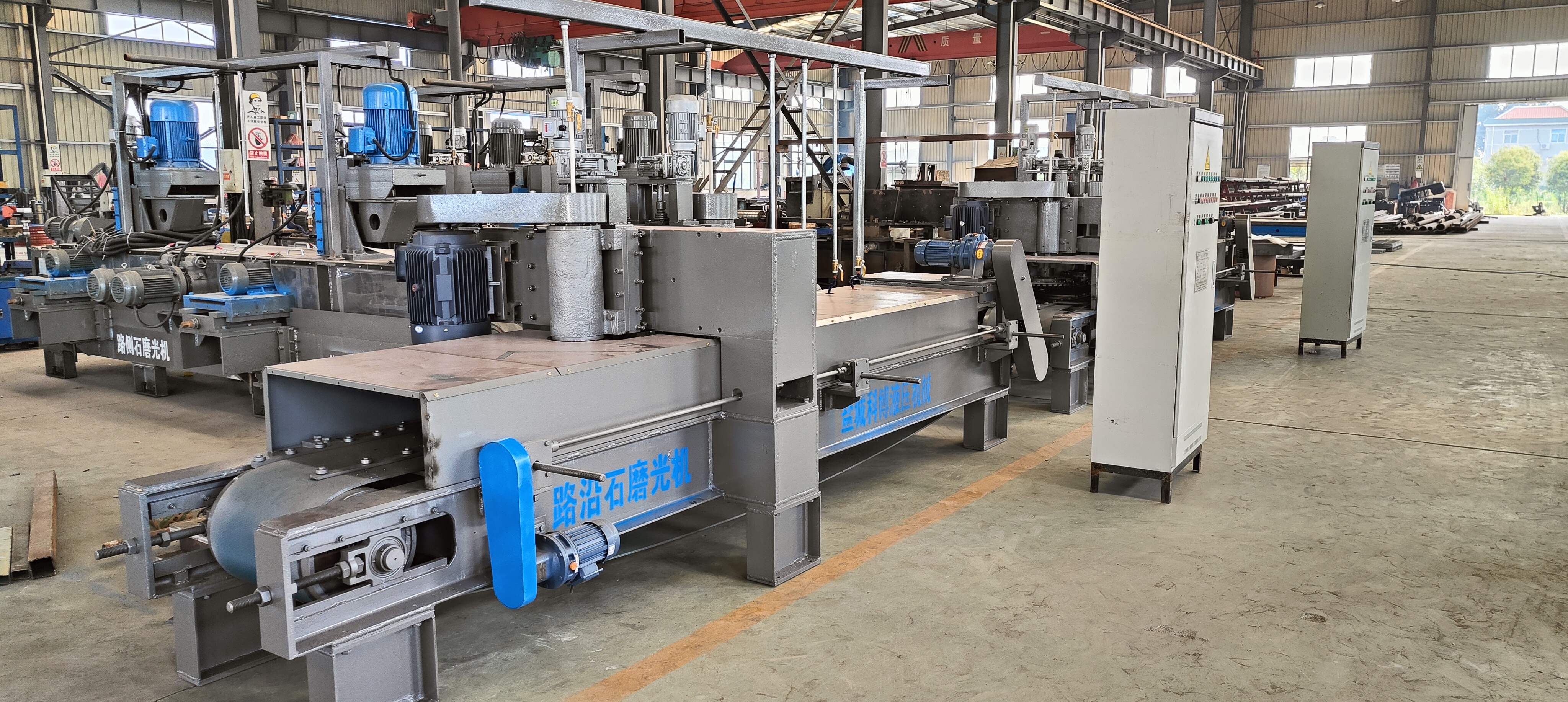 Kerbstone polishing machine used for polishing stone surface. By using different size grinding heads and pads, it can achieve the smooth treatment of different surfaces of kerbstone, so that it has a good luster and touch. Use air pressure controls the lifting and lowering of the grinder, and the magnitude of the pressurization pressure is adjustable: the swinging beam drives the grinder, and the movement speed is adjustable; the belt conveyor workbench, and the belt running speed is adjustable: the electrical system adopts PLC and human-machine interface.The machine has 23 polishing heads including 2 fixed thickness,8 flat grinding,8 side grinding,1 oblique cutting, 4 chamfer,high automation to easy to operate and good grinding effect, which plays an important role in improving the decorative effect of kerbstone.
